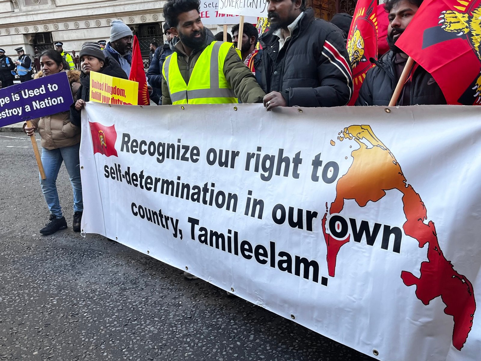 Hundreds of protesters convened outside the Sri Lankan High Commission  then marched through to The No. 10 Downning Street London, carrying banners. The atmosphere was charged, with speakers from various Tamil organisations addressing the crowd, emphasising the need for international attention to the plight of Tamils in Sri Lanka.